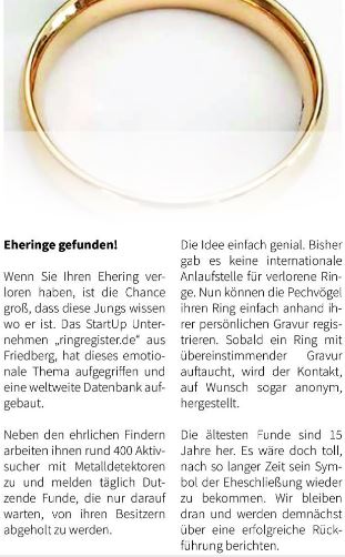 ...ich habe meinen Ehering am Strand auf Rügen verloren. Aufgrund des Aufrufes von ringregister.de wurde er gefunden. Ich freue mich so sehr darüber, weil ich beim besten Willen nicht mehr daran geglaubt habe! Danke!!!